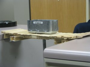 dude we had to make a bridge out of popsicle sticks and elmers glue. mine came in first(with it never breaking or bending or even making cracking sounds)and it held over 160 pounds!!!!!!!!! BEAT THAT!!!!!!!!!!!!
