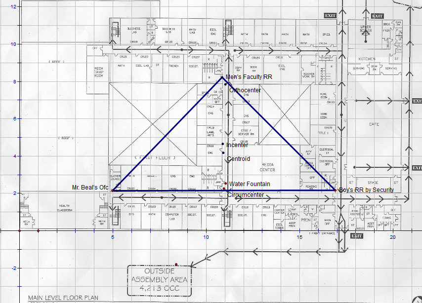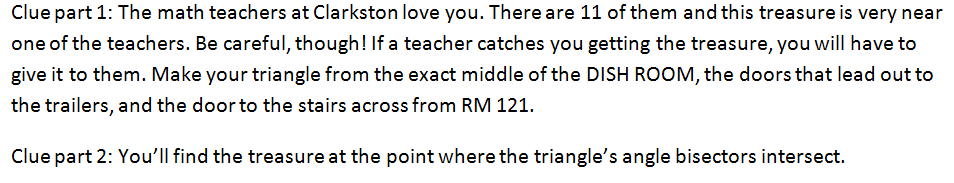 The kids used Geometer’s Sketchpad with an embedded blueprint of our school (upstairs and down) to locate vertices of a triangle as given in a clue, then constructed all 4 points of concurrency. Upon showing me their 4 points, I unlocked a second part of their clue: hints that told them which point of concurrency marks the spot. In a mad dash, the kids grabbed the hall pass, a camera, and embarked on finding the flag. If a teacher or administrator busted them breaking rules or removing the treasure, they forfeited it. Students returned with photographic evidence of them at the site of the treasure flag.