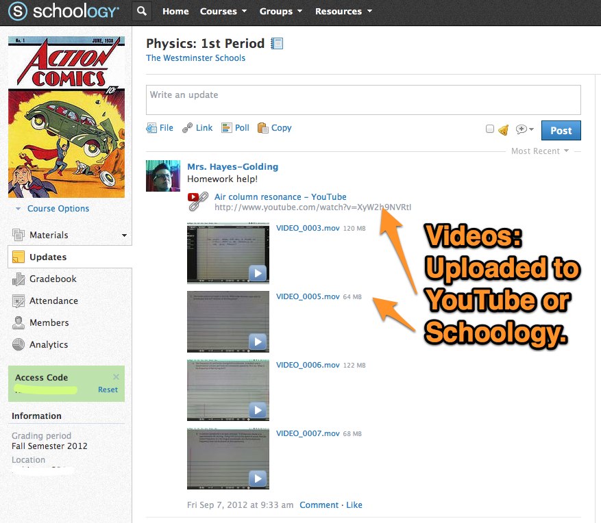 - Post recording to video host of your choice — I’ve used YouTube and Schoology to test this out. Files can be quite large, so storage on something like Schoology may be problematic over the course of a year (64 Mb for approx 3 minutes at a YouTube type resolution).