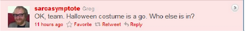 (7:15pm Sunday) Greg (@sarcasymptote) reminds us if you’re doing twittereen you should save the pic of the person you are dressing as. In his words, “shit gets real confusing otherwise when trying to pull together compilations.” Spoken like a true veteran, Greg.