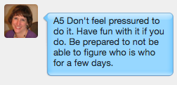 You want Lisa’s blog “Twittereen 2011 — for Sam” because she kept record of the Tweets as folks revealed themselves.