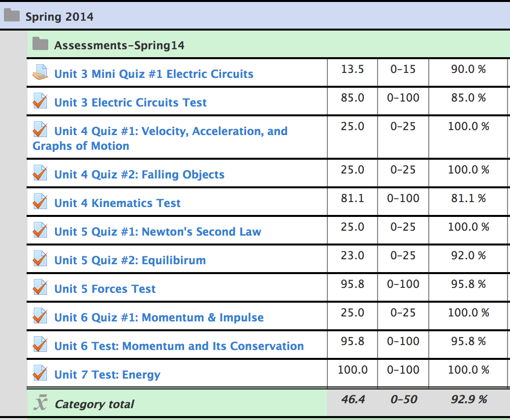 Will you be using the Moodle gradebook? I really like it for its flexibility. At left is a section of the student view.