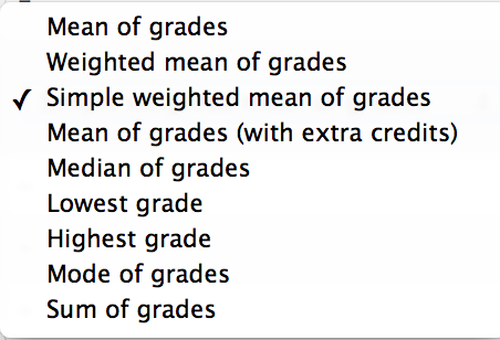 Aside from the usual stuff (setting up categories with grade weights), I can choose from way more methods of calculating a score than I even know what to do with: