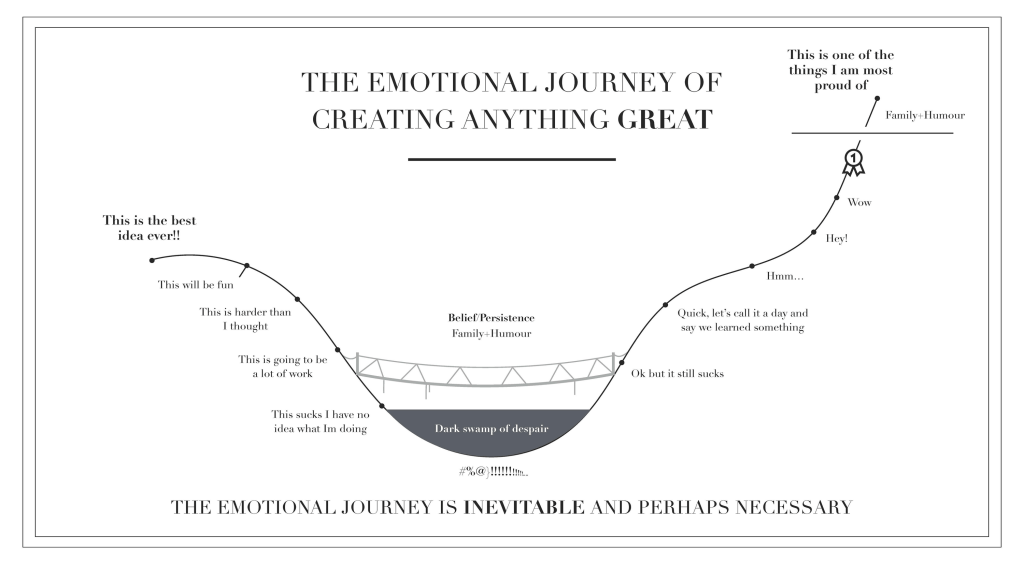 Welcome to The Emotional Journey of Creating Anything Great! This graphic helps me stay grounded when working on difficult projects. I like remind myself that the rollercoaster of emotions I’m going through is totally normal and typical. New projects start with enthusiasm, “This is the best idea ever!!”. Once I get rolling, I quickly move from “This will be fun” to “This is harder than I thought”. My enthusiasm is waning and is replaced by confusion. I don’t know what to do. I don’t know how to solve this problem. I’m a dummy. I’ve arrived to the pit of despair. (Gen X’ers, is it just me or does this sound like The Neverending Story’s Swamp of Sadness?)