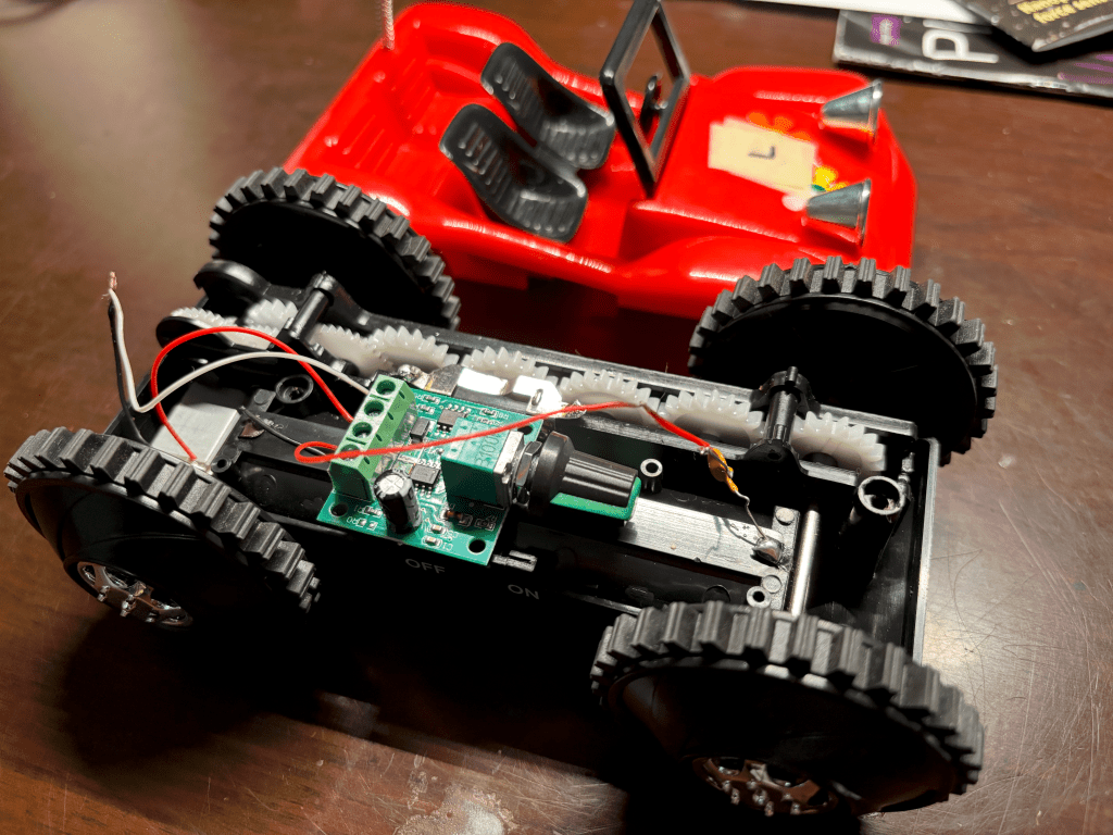 Using an inexpensive DC motor controller, I made the following proof-of-concept. Maybe I’ll tidy things up by installing the controller into the decorative cover of the car. I personally think having the knob stick out the tail end of the car would be cute.